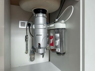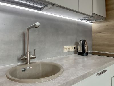 Смеситель с питьевой очищенной водой, измельчитель бытовых отходов, варочная панель на 2 конфорки, вытяжка, холодильник.