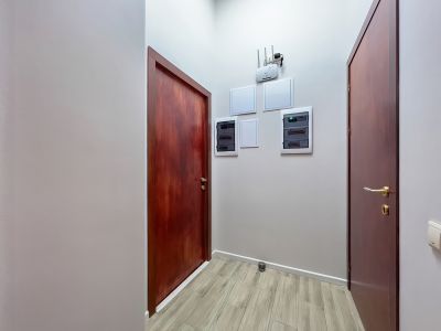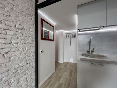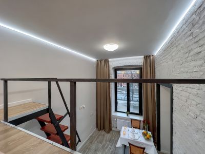 Датчики тепла и влажности. Чистый двор и парадная. Во дворе есть возможность парковать автомобиль. Общая площадь студии, включая второй ярус составляет 22 квадратных метра.